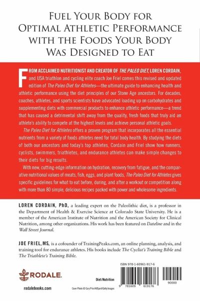A breakthrough nutrition strategy for optimum athletic performance, weight loss and peak health based on the Stone Age diet humans were designed to eat. Paleo-style diets are all the rage as fitness enthusiasts, including the booming nation of CrossFitters, have adopted high protein, low-processed-food diets to fuel their exercise. It all began with the publication of the book The Paleo Diet by renowned scientist Loren Cordain, Ph.D., who presented a breakthrough plan for weight loss and disease prevention without dieting or exercising. In 2005, Dr. Cordain joined with endurance coach Joe Friel to write The Paleo Diet for Athletes. Now, the authors offer an updated and revised edition of The Paleo Diet for Athletes specifically targeting runners, triathletes, and other serious amateur athletes. Cordain and Friel show that by using the foods our bodies were designed to eat—protein, fruits and vegetables, healthy fats and even some saturated fats--anyone can achieve total-body fitness and dramatically improve the strength and cardiovascular efficiency. The Paleo Diet for Athletes gives specific guidelines for what to eat before, during and after a workout or competition along with simple, tasty recipes packed with power and wholesome ingredients.