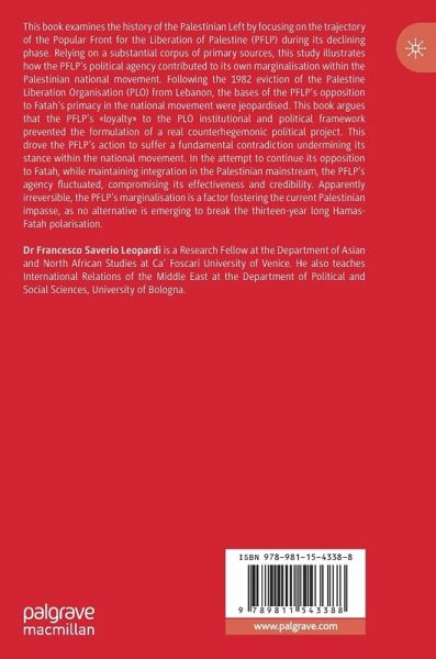 This book examines the history of the Palestinian Left by focusing on the trajectory of the Popular Front for the Liberation of Palestine (PFLP) during its declining phase. Relying on a substantial corpus of primary sources, this study illustrates how the PFLP's political agency contributed to its own marginalisation within the Palestinian national movement. Following the 1982 eviction of the Palestine Liberation Organisation (PLO) from Lebanon, the bases of the PFLP's opposition to Fatah's primacy in the national movement were jeopardised. This book argues that the PFLP's «loyalty» to the PLO institutional and political framework prevented the formulation of a real counterhegemonic political project. This drove the PFLP's action to suffer a fundamental contradiction undermining its stance within the national movement. In the attempt to continue its opposition to Fatah, while maintaining integration in the Palestinian mainstream, the PFLP's agency fluctuated, compromising itseffectiveness and credibility. Apparently irreversible, the PFLP's marginalisation is a factor fostering the current Palestinian impasse, as no alternative is emerging to break the thirteen-year long Hamas-Fatah polarisation.