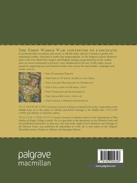 The First World War continues to fascinate. Its profound effect on politics and society is still felt today. Yet it remains a greatly misunderstood conflict, shrouded in myths and misperceptions. In "The Palgrave Concise Historical Atlas of the First World War" Philpott and Hughes, leading young historians of the conflict, draw on recent scholarship to present a clear introduction to the war. In fifty maps, accompanied by supporting text and statistical tables, they survey the main battles and political features of the war. This concise volume will give students and general readers important insights into the nature and effects of world war.