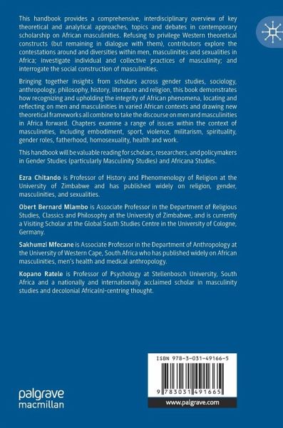 Ezra Chitando is Professor of History and Phenomenology of Religion at the University of Zimbabwe and has published widely on religion, gender, masculinities, and sexualities. He is co-editor/co-author of over 50 books including Christianity and Controversies Over Homosexuality in Africa; Public Religion and The Politics of Homosexuality in Africa; and Redemptive Masculinities: Men, HIV and Religion. Chitando has completed research fellowships in Germany, Sweden, Scotland, and the US. Obert Bernard Mlambo is Associate Professor in the Department of Religious Studies, Classics and Philosophy at the University of Zimbabwe, and is currently a Visiting Scholar at the Global South Studies Centre in the University of Cologne, Germany. He is also a former recipient of the Fondation Hardt¿s Doctoral Researchers Fellowship (Geneva, Switzerland, 2013) and the Nordic Africa Institute's Guest Scholar Fellowship (Uppsala, Sweden, 2016). Mlambo has taken up Visiting Research Fellowships and Professorships in the UK, Germany, South Africa and has presented conference papers in many other countries. Sakhumzi Mfecane is Associate Professor in the Department of Anthropology at the University of Western Cape, South Africa who has published widely on African masculinities, men's health and medical anthropology. His research has appeared in a number of international, peer-reviewed journals including South African Review of Sociology, Social Dynamics, International Journal of Men's Health, Culture, Health and Sexuality, Anthropology Southern Africa, and African Journal of AIDS Research. Kopano Ratele is Professor of Psychology at Stellenbosch University, South Africa and a nationally and internationally acclaimed scholar in masculinity studies and decolonial Africa(n)-centring thought. His published works include From Boys to Men: Social Constructions of Masculinity in Contemporary Society (2008), There Was This Goat: Investigating the Truth Commission Testimony of Notrose Nobomvu Konile (2009), Liberating Masculinities (2016), Engaging Youth in Activism, Research and Pedagogical Praxis: Transnational and Intersectional Perspectives on Gender, Sex, and Race (2018), The World Looks Like This From Here: Thoughts on African Psychology (2019), and Why Men Hurt Women and Other Reflections on Love, Violence and Masculinity (2022).