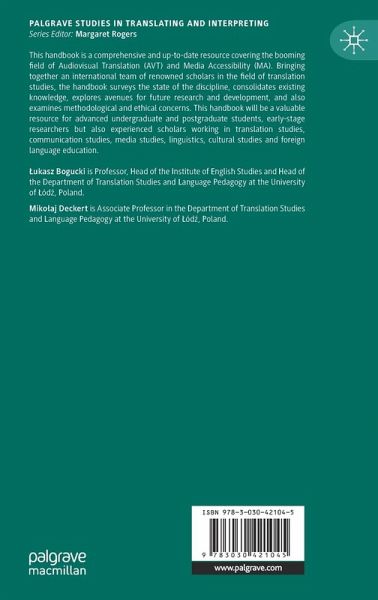 This handbook is a comprehensive and up-to-date resource covering the booming field of Audiovisual Translation (AVT) and Media Accessibility (MA). Bringing together an international team of renowned scholars in the field of translation studies, the handbook surveys the state of the discipline, consolidates existing knowledge, explores avenues for future research and development, and also examines methodological and ethical concerns. This handbook will be a valuable resource for advanced undergraduate and postgraduate students, early-stage researchers but also experienced scholars working in translation studies, communication studies, media studies, linguistics, cultural studies and foreign language education.