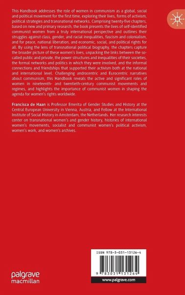 This Handbook addresses the role of women in communism as a global, social and political movement for the first time, exploring their lives, forms of activism, political strategies and transnational networks. Comprising twenty-five chapters, based on new and primary research, the book presents the lives of self-identified communist women from a truly international perspective and outlines their struggles against fascism and colonialism, and for women's emancipation and national liberation. By using the lens of transnational political biography, the chapters capture the broader picture of these women's lives, unpacking the links between the so-called public and private, the power structures and inequalities of their societies, the formal networks and politics in which they were involved, and the informal connections and friendships that supported their activism both at the national and international level. Challenging androcentric and Eurocentric narratives about communism, this Handbook reveals the active and significant roles of women in nineteenth- and twentieth-century communist movements and regimes, and highlights the importance of communist women in shaping the agenda for women's rights worldwide.
