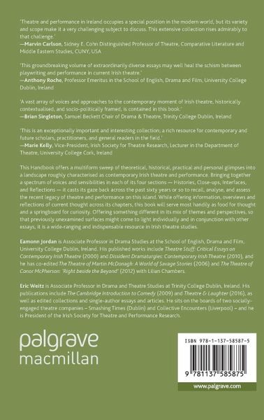 This Handbook offers a multiform sweep of theoretical, historical, practical and personal glimpses into a landscape roughly characterised as contemporary Irish theatre and performance. Bringing together a spectrum of voices and sensibilities in each of its four sections - Histories, Close-ups, Interfaces, and Reflections - it casts its gaze back across the past sixty years or so to recall, analyse, and assess the recent legacy of theatre and performance on this island. While offering information, overviews and reflections of current thought across its chapters, this book will serve most handily as food for thought and a springboard for curiosity. Offering something different in its mix of themes and perspectives, so that previously unexamined surfaces might come to light individually and in conjunction with other essays, it is a wide-ranging and indispensable resource in Irish theatre studies.