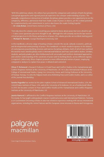 PART I: DISCIPLINARY PERSPECTIVES1. History Peace in History; John Gittings 2. Politics and Governance: From Emergency to Emergence; David Chandler 3. Philosophy: The Philosophy of Peace; Nick Rengger 4. International Relations: Peace in International Relations Theory; Oliver P. Richmond 5. Anthropology: Implications for Peace; Geneviève Souillac and Douglas P. Fry 6. Arts and Theatre for Peacebuilding; Nilanjana Premaratna and Roland Bleiker 7. Sociology: A Sociological Critique of Liberal Peace; Nicos Trimikliniotis 8. Economics: Neoliberal Peace and the Politics of Social Economics; Brendan Murtagh 9. Geography: Geography and Peace; Nick Megoran, Fiona McConnell and Phillipa Williams 10. Development: Peace and Development Studies; Caroline Hughes 11. Postcolonialism: A Postcolonial Perspective on Peacebuilding; Vivienne Jabri 12. Religion: Peace through Non-Violence in Four Religious Traditions; Caron Gentry 13. Gender: The Missing Piece in the Peace Puzzle; Annika Bjorkdahl and Johanna M. Selimovic 14. Education: Cultural Reproduction, Revolution and Peacebuilding in Conflict-affected Societies; Tejendra Pherali 15. Children: Children and Peace; Ben Collins and Alison Watson 16. Social Psychology: Social Psychology and Peace; Shelley McKeown and Daniel Christie 17. Humanitarianism: Humanitarianism and Peace; Jenny H. Peterson 18. International Law: To End the Scourge of War and to Build a Just Peace?; Wendy Lambourne 19. Indigeneity and Peace; Morgan Brigg and Polly O. Walker 20. Critical Security Studies: Alternative Dialogues for Peace - Reconstructing 'Language Barriers' and 'Talking Points'; Faye Donnelly PART II: REGIONAL PERSPECTIVES21. South Africa's Incomplete Peace; Andries Odendaal 22. West Africa: Peace in West Africa; Patrick Tom 23. The Great Lakes Region of Africa; Local Perspectives on Liberal Peacebuilding from the Democratic Republic of Congo; Josaphat M. Bussy and Carol Gallo 24. The Horn of Africa: Peace in the Horn of Africa; Christopher Clapham 25. Southeast Asia: Peace through Retribution or Reconciliation? Some Insights and Evidence from Southeast Asia; Sorpong Peou 26. East Asia: Understanding the Broken Harmony in Confucian Asia; Ching-Chang Chen 27. South Asia: Human Development and Minority Empowerment Exploring Regional Perspectives on Peace in South Asia; Florian Krampe and Ashok Swain 28. Emerging Countries: Peace and the Emerging Countries; Kai Michael Kenkel 29. Central Asia Central Asia: Contested Peace; David Lewis 30. Middle East and North Africa: Hegemonic Modes of Pacification in Crisis; Sandra Pogodda 31. Europe: Peace in Europe; Roberto Belloni 32. Balkans; Jasmin Ramovic 33. South America; Peacebuilding in South America: Roddy Brett and Diana Florez 34. Central America: From War to Violence; Jenny Pearce 35. North America: Peace Studies versus the Hegemony of Realist and Liberal Methods; Henry F. Carey 36. Pacific: Peace in the Pacific Grounded in Local Custom, Adapting to Change; Volker Boege