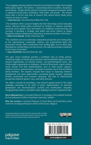 This open access handbook provides a multilevel view on family policies, combining insights on family policy outcomes at different levels of policymaking: supra-national organizations, national states, sub-national or regional levels, and finally smaller organizations and employers. At each of these levels, a multidisciplinary group of expert scholars assess policies and their implementation, such as child income support, childcare services, parental leave, and leave to provide care to frail and elderly family members. The chapters evaluate their impact in improving children's development and equal opportunities, promoting gender equality, regulating fertility, productivity and economic inequality, and take an intersectional perspective related to gender, class, and family diversity. The editors conclude by presenting a new research agenda based on five major challenges pertaining to the levels of policy implementation (in particular globalization and decentralization), austerityand marketization, inequality, changing family relations, and welfare states adapting to women's empowered roles.