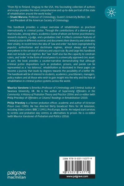 "The handbook features a superb collection of thirty-seven substantive chapters, written by more than sixty contributors. The breadth and depth of the material is impressive ... . a handbook that not only shines light on the diversity of rehabilitative work across the globe but instils a sense of hope, passion and empathy in the reader situates The Palgrave Handbook of Global Rehabilitation in Criminal Justice as an essential read for anyone interested in the theory, policy and/or practice of rehabilitation." (Helena Gosling, International Criminology, September 13, 2023)