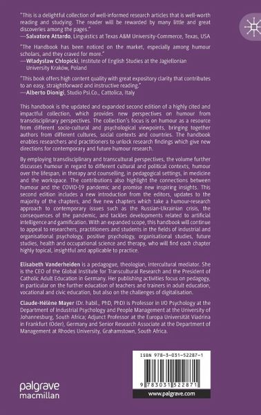 By employing transdisciplinary and transcultural perspectives, the volume further discusses humour in regard to different cultural and political contexts, humour over the lifespan, in therapy and counselling, in pedagogical settings, in medicine and the workspace. The contributions also highlight the connections between humour and the COVID-19 pandemic and promise new inspiring insights. This second edition includes a new introduction from the editors, updates to the majority of the chapters, and five new chapters which take a humour-research approach to contemporary issues such as the Russian-Ukrainian crisis, the consequences of the pandemic, and tackles developments related to artificial intelligence and gamification. With an expanded scope, this handbook will continue to appeal to researchers, practitioners and students in the fields of industrial and organisational psychology, positive psychology, organisational studies, future studies, health and occupational science and therapy, who will find each chapter highly topical, insightful and applicable to practice.