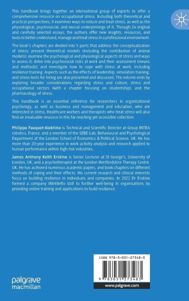The book's chapters are divided into 5 parts that address the conceptualisation of stress; present theoretical models (including the contribution of animal models); examine the psychological and physiological aspects of stress and ways to assess it; delve into psychosocial risks at work and their assessment (means and methods); and investigate how to cope with stress at work, including resilience training. Aspects such as the effects of leadership, simulation training, and stress-tests for hiring are also presented and discussed. The volume ends by exploring broader considerations regarding stress and culture, stress and occupational sectors (with a chapter focusing on studentship), and the pharmacology of stress.