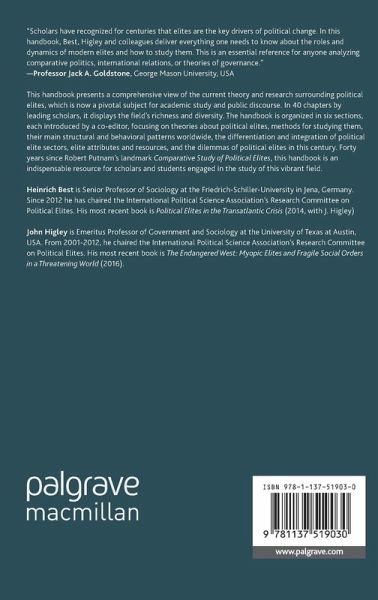 Introduction to the Palgrave Handbook of Political Elites; Heinrich Best and John Higley.- Chapter 1: Introduction to Section I: The Development of Elite Theory; Jan Pakulski.- Chapter 2: Classical Elite Theory: Pareto and Weber; Jan Pakulski.- Chapter 3: Continuities and Discontinuities in Elite Theory; John Higley.- Chapter 4: Political Elites and Democracy; András Körösényi.- Chapter 5: Theory-Based Typologies of Political Elites; Ursula Hoffmann-Lange.- Chapter 6: Introduction to Section II: Research Methods for Studying Elites; Elena Semenova.- Chapter 7: Methods of Elite Identification; Ursula Hoffmann-Lange.- Chapter 8: Surveying & Observing Political Elites; Juan Rodríguez-Teruel and Jean-Pascal Daloz.- Chapter 9: Temporal Methods in Political Elite Studies; Sebastian Jäckle and Matthew Kerby.- Chapter 10: Analyses of Elite Networks; Franziska Barbara Keller.- Chapter 11: Introduction to Section III: Patterns of Political Elites; John Higley.- Chapter 12: Pre-Modern Power Elites: Princes, Courts, Intermediaries; Jeroen Duindam.- Chapter 13: Political Elites in the Middle East and North Africa; Clement Henry.- Chapter 14: Political Elites in South Asia; Philip Oldenburg.- Chapter 15: Political Elites in Southeast Asia; William Case.- Chapter 16: Political Elites in Sub-Saharan Africa; Jean-Pascal Daloz.- Chapter 17: Political Elites in Latin America; Cristóbal Rovira Kaltwasser.- Chapter 18: The Political Elite in Post-Soviet Russia; Peter Rutland.- Chapter 19: The PoliticalElite in China: A Dynamic Balance between Integration and Differentiation; Cheng Li.- Chapter 20: Political Elites in the West; John Higley.- Chapter 21: Introduction to Section IV: Elite sectors: Differentiation and Integration; Heinrich Best.- Chapter 22: Representative Elites; Heinrich Best and Lars Vogel.- Chapter 23: Executive Elites; Luca Verzichelli.- Chapter 24: Non-Elected Political Elites in EU; Niilo Kauppi and Mikael Rask Madsen.- Chapter 25: Economic Elites; Michael Hartmann.- Chapter 26: Media Elites; Eva Mayerhöffer & Barbara Pfetsch.- Chapter 27: Models of Elite Integration; Fredrik Engelstad.- Chapter 28: Introduction to Section V: Elite Attributes and Resources; Jean-Pascal Daloz & Ursula Hoffmann-Lange.- Chapter 29: The Personality Attributes of Political Elites; Gian Vittorio Caprara & Jo Silvester.- Chapter 30: Political and Social Backgrounds of Political Elites; Daniel Gaxie.- Chapter 31: Political Elites and Symbolic Superiority; Jean-Pascal Daloz.- Chapter 32: Norms and Orientations of Political Elites; Bernhard Weßels.- Chapter 33: Power Networks; David Knoke.- Chapter 34: Introduction to Section VI: Elite Dynamics and Dilemmas; Maurizio Cotta.- Chapter 35: Elite Circulation and Stability; Luca Verzichelli.- Chapter 36: Democratization: The Role of Elites; Philippe C. Schmitter.- Chapter 37: Sub-National Political Elites; Filippo Tronconi.- Chapter 38: Elites or Leadership? Opposite or Complementary Paradigms?; Jean Blondel.- Chapter 39: Political Elites Beyond The Nation State; Maurizio Cotta.