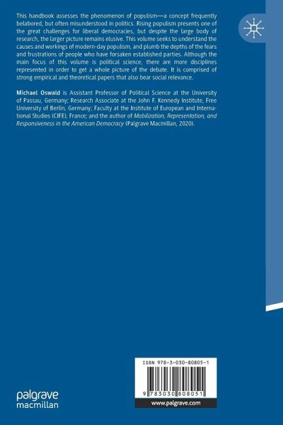 This handbook assesses the phenomenon of populism-a concept frequently belabored, but often misunderstood in politics. Rising populism presents one of the great challenges for liberal democracies, but despite the large body of research, the larger picture remains elusive. This volume seeks to understand the causes and workings of modern-day populism, and plumb the depths of the fears and frustrations of people who have forsaken established parties. Although the main focus of this volume is political science, there are more disciplines represented in order to get a whole picture of the debate. It is comprised of strong empirical and theoretical papers that also bear social relevance.