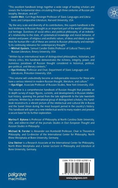 1. Introduction: On Russian Thought and Intellectual Tradition.- 2. Politics and Enlightenment in Russia.- 3. Russian Religious Philosophy: The Nature of the Phenomenon, Its Path, and Its Afterlife.- 4. Russian Political Philosophy: Between Autocracy and Revolution.- 5. Between Aristocratism and Artistry: Two Centuries of the Revolutionary Paradigm in Russia.- 6. Kant and Kantianism in Russia: a Historical Overview.- 7. Hegel's Philosophy of Freedom in Nineteenth-Century Russia.- 8. Vladimir Solovyov: Philosophy as Systemic Unity.- 9. Natural Sciences and the Radical Intelligentsia in the Late Nineteenth and Early Twentieth Centuries.- 10. Lev Shestov's Philosophy of Freedom.- 11. Nikolai Berdyaev's Philosophy of Creativity as a Revolt against the Modern Worldview.- 12. Lenin and His Controversy over Philosophy: On the Philosophical Significance of Materialism and Empiriocriticism.- 13. Russian Marxism and its Philosophy: From Theory to Ideology.- 14. Between East and West:Russian Identity in the Émigré Writings of Ilya Fondaminsky and Semyon Portugeis.- 15. Ivan A. Ilyin: Russia's "Non-Hegelian" Hegelian.- 16. Gustav Shpet's Path Through Phenomenology to Philosophy of Language.- 17. Evald Ilyenkov: Philosophy as the Science of Thought.- 18. The "Men of the Sixties": Philosophy as a Social Phenomenon.- 19. The Activity Approach in Late Soviet Philosophy.- 20. A Return to Tradition: The Epistemological Style in Russia's Post-Soviet Philosophy.- 21. The Russian Novel as a Medium of Moral Reflection in The Long Nineteenth Century.- 22. Nikolai Gogol, Symbolic Geography, and the Invention of the Russian Provinces.- 23. Belinsky and the Sociality of Reason.- 24. The Vocations of Nikolai Grot and the Tasks of Russian Philosophy .- 25. Chernyshevsky and Dostoevsky: Together in Opposition.- 26. Tolstoy's Philosophy of Life.- 27. "Teaching of Life": Tolstoy's Moral-Philosophical Aesthetics.- 28. Osip Mandelstam's Poetic Practice and Theory and Pavel Florensky's Philosophical Contexts.- 29. Future in the Past: Mikhail Bakhtin's Thought between Heritage and Reception.- 30. Across Time and Language: Bakhtin, Translation, World Literature.- 31. Alexei F. Losev's Mythology of Music as a Development of the Hermeneutics and Sociology of Music.- 32. The Young Marx and the Tribulations of Soviet Marxist-Leninist Aesthetics.- 33. Mikhail Sholokhov, Andrei Platonov, and Varlam Shalamov: The Road to Hell in Early Twentieth-Century Russian Literature.- 34. Yuri Lotman and the Moscow-Tartu School of Semiotics: Contemporary Epistemic and Social Contexts.- 35. Art as an Instrument of Philosophy.- 36. Russian Thought and Russian Thinkers.