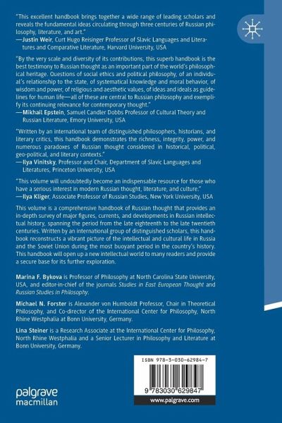 1. Introduction: On Russian Thought and Intellectual Tradition.- 2. Politics and Enlightenment in Russia.- 3. Russian Religious Philosophy: The Nature of the Phenomenon, Its Path, and Its Afterlife.- 4. Russian Political Philosophy: Between Autocracy and Revolution.- 5. Between Aristocratism and Artistry: Two Centuries of the Revolutionary Paradigm in Russia.- 6. Kant and Kantianism in Russia: a Historical Overview.- 7. Hegel's Philosophy of Freedom in Nineteenth-Century Russia.- 8. Vladimir Solovyov: Philosophy as Systemic Unity.- 9. Natural Sciences and the Radical Intelligentsia in the Late Nineteenth and Early Twentieth Centuries.- 10. Lev Shestov's Philosophy of Freedom.- 11. Nikolai Berdyaev's Philosophy of Creativity as a Revolt against the Modern Worldview.- 12. Lenin and His Controversy over Philosophy: On the Philosophical Significance of Materialism and Empiriocriticism.- 13. Russian Marxism and its Philosophy: From Theory to Ideology.- 14. Between East and West:Russian Identity in the Émigré Writings of Ilya Fondaminsky and Semyon Portugeis.- 15. Ivan A. Ilyin: Russia's "Non-Hegelian" Hegelian.- 16. Gustav Shpet's Path Through Phenomenology to Philosophy of Language.- 17. Evald Ilyenkov: Philosophy as the Science of Thought.- 18. The "Men of the Sixties": Philosophy as a Social Phenomenon.- 19. The Activity Approach in Late Soviet Philosophy.- 20. A Return to Tradition: The Epistemological Style in Russia's Post-Soviet Philosophy.- 21. The Russian Novel as a Medium of Moral Reflection in The Long Nineteenth Century.- 22. Nikolai Gogol, Symbolic Geography, and the Invention of the Russian Provinces.- 23. Belinsky and the Sociality of Reason.- 24. The Vocations of Nikolai Grot and the Tasks of Russian Philosophy .- 25. Chernyshevsky and Dostoevsky: Together in Opposition.- 26. Tolstoy's Philosophy of Life.- 27. "Teaching of Life": Tolstoy's Moral-Philosophical Aesthetics.- 28. Osip Mandelstam's Poetic Practice and Theory and Pavel Florensky's Philosophical Contexts.- 29. Future in the Past: Mikhail Bakhtin's Thought between Heritage and Reception.- 30. Across Time and Language: Bakhtin, Translation, World Literature.- 31. Alexei F. Losev's Mythology of Music as a Development of the Hermeneutics and Sociology of Music.- 32. The Young Marx and the Tribulations of Soviet Marxist-Leninist Aesthetics.- 33. Mikhail Sholokhov, Andrei Platonov, and Varlam Shalamov: The Road to Hell in Early Twentieth-Century Russian Literature.- 34. Yuri Lotman and the Moscow-Tartu School of Semiotics: Contemporary Epistemic and Social Contexts.- 35. Art as an Instrument of Philosophy.- 36. Russian Thought and Russian Thinkers.