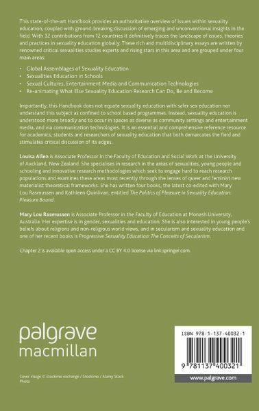 Introduction; Louisa Allen and Mary-Lou Rasmussen.- PART I: GLOBAL ASSEMBLAGES OF SEXUALITY EDUCATION.- Introduction; Mary Jane Kehily and Anoop Nayak.- Chapter 1. 'Sex and History': Talking Sex with Objects from the Past; Kate Fisher, Jen Grove, and Rebecca Langlands.- Chapter 2. The Manufacture of Consensus - The Development of UNESCO's International Technical Guidance on Sexuality; Peter Aggleton and Ekua Yankah.- Chapter 3. Sexuality Education in Ghana and Mozambique: An Examination of Colonising Assemblages Informing School-based Sexuality Education Initiatives; Esther Miedema and Georgina Yaa Oduro.- Chapter 4. More Than 'Just Learning About the Organs': Embodied Story Telling as a Basis for Learning About Sex and Relationships; Kate Senior and Richard Chenall.- Chapter 5. Faith, Progressive Sexuality Education and Queer Secularism: Unsettling Associations; Mary Lou Rasmussen.- Chapter 6. The Cultural Politics of Sex Education in the Nordics; Stine H. Bang Svendsen.- Chapter7. Teaching Sexuality, Teaching Religion: Sexuality Education and Religion in Canada; Heather Shipley.- Chapter 8. A Radical Plurality; Louisa Allen and Kathleen Quinlivan.- Chapter 9. Learning from the Learners: How Research with Young People Can Provide Models of Good Pedagogic Practice in Sexuality Education in South Africa; Rob Pattman and Deevia Bhana.- PART II: SEXUALITIES EDUCATION IN SCHOOLS.- Introduction: Pub(l)ic Dis'plays; Sara I. McClelland and Michelle Fine.- Chapter 10. Sexuality Education in Early Childhood; Kerry Robinson and Cristyn Davies.- Chapter 11. Preschool Sexuality Education?!; Karin A. Martin and Lacey Bobier.- Chapter 12. Pleasurable Blackness; Jennifer Nash.- Chapter 13. Sexuality Education in the Context of Mass Incarceration: Interruptions and Entanglements; Jessica Fields and Signy Toquinto.- Chapter 14. Sex Education, Youth and Advocacy: Sexual Literacy, Critical Media and Intergenerational Sex Education(s); Marisa Ragonese, Christin Bowman, and Deborah Tolman.- Chapter 15. Immigration, Undocumented Students, and Sexuality Education in Schools: Collapsing Borders; Leigh Patel and Lauren P. Saenz.- Chapter 16. Critically Sex/Ed: Asking Critical Questions of Neoliberal Truths in Sexuality Education; Laina Y. Bay-Cheng.- Chapter 17. Intersex Bodies in Sexuality Education: On the Edge of Cultural Difference; Annette Brömdal, Mary Lou Rasmussen, Fida Sanjakdar, Louisa Allen, and Kathleen Quinlivan.- Chapter 18. 'Getting It Right'? Working the ImPossibilities of Race and Gender in Neo-Liberal School Based Sexuality Education; Kathleen Quinlivan.- PART III: SEXUAL CULTURES, ENTERTAINMENT MEDIA AND COMMUNICATION TECHNOLOGIES.- Introduction; Kath Albury and Alan McKee.- Chapter 19. What Does the News Teach Young people About Sex?; Despina Chronaki.- Chapter 20. Touching Affect: The Pedagogy of Intimate and Banal Moments in Glee; Kyra Clarke.- Chapter 21. Learning About Mobile Sexual Identities From Queer as Folk; Rob Cover.- Chapter 22. Catolicadas: A Sexuality Education Animated Series; Evelyn Aldaz, Sandra Fosado, and Ana Amuchástegui.- Chapter 23. Sex Bait: Sex Talk on Commercial Blogs as Informal Sexuality Education; Crystal Abidin.- Chapter 24. Social Media Bodies: Revealing the Entanglement of Sexuality, Mental Health, and Social Media in Education; Natalie Hendry.- Chapter 25. From Media Abstinence to Media Production: Sexting and Young People and Education; Kath Albury, Amy Adele Hasinof and Theresa Senft.- PART IV: RE-ANIMATING WHAT ELSE SEXUALITY EDUCATION RESEARCH CAN DO, BE, AND BECOME.- Introduction;Emma Renold and Jessica Ringrose.- Chapter 26. Adolescence, Trans Phenomena and the Politics of Sexuality Education; Gabrielle Owen.- Chapter 27. Possibilities for Pleasure: Creative Approaches to Sexuality Education in Informal and Community Education; Esther Mcgeeney.- Chapter 28. Queer Departures into More-Than-Human Worlds; Affrica Taylor and Mindy Blaise.- Chapter 29. The Power of Things! A 'New' Ontology ofSexuality At School; Louisa Allen.- Chapter 30. Pin-Balling And Boners: The Posthuman Phallus And Intra-Activist Sexuality Assemblages In Secondary School; Emma Renold and Jessica Ringrose.- Chapter 31. Materialism and Micropolitics in Sexualities Education Research; Pam Alldred and Nick J Fox.- Chapter 32. 'Not Better, Just Different': Reassembling Sexuality Education Research Through the Deleuzian 'Posts'; Ian Thomas