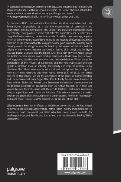 By the early 1830s the old school of Gothic literature was exhausted. Late Romanticism, emphasising as it did the uncertainties of personality and imagination, gave it a new lease of life. Gothic-the literature of disturbance and uncertainty-now produced works that reflected domestic fears, sexual crimes, drug filled hallucinations, the terrible secrets of middle class marriage, imperial horror at alien invasion, occult demonism and the insanity of psychopaths. It was from the 1830s onwards that the old gothic castle gave way to the country house drawing room, the dungeon was displaced by the sewers of the city and the villains of early novels became the familiar figures of Dr Jekyll and Mr Hyde, Dracula, Dorian Grey and Jack the Ripper. After the death of Prince Albert (1861), the Gothic became darker, more morbid, obsessed with demonic lovers, blood sucking ghouls, blood stained murderers and deranged doctors. Whilst the gothic architecture of the Houses of Parliament and the new Puginesque churches upheld a Victorian ideal of sobriety, Christianity and imperial destiny, Gothic literature filed these new spaces with a dread that spread like a plague to America, France, Germany and even Russia. From 1830 to 1914, the period covered by this volume, we saw the emergence of the greats of Gothic literature and the supernatural from Edgar Allan Poe to Emily Bronte, from Sheridan Le Fanu to Bram Stoker and Robert Louis Stevenson. Contributors also examine the fin-de-siècle dreamers of decadence such as Arthur Machen, M P Shiel and Vernon Lee and their obsession with the occult, folklore, spiritualism, revenants, ghostly apparitions and cosmic annihilation. This volume explores the period through the prism of architectural history, urban studies, feminism, 'hauntology' and much more. 'Horror', as Poe teaches us, 'is the soul of the plot'.