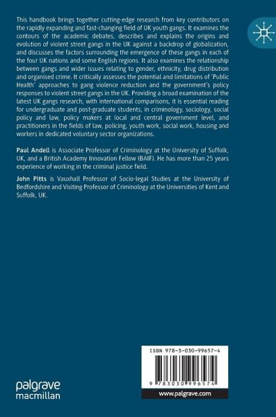 Chapter 1: Introduction.- Part I: The Evolution of the UK Street Gang.- Chapter 2: Theorising Gangs.- Chapter 3: Reluctant Gangsters 'Revisited.- Chapter 4: County Lines; Dealing in Vulnerability.- Part II: International Comparisons.- Chapter 5: US and UK Gangs: Models, Policy and Practice.- Chapter 6: Gangs and a Global Sociological Imagination.- Chapter 7: Why them?' 'Why then?' 'Why there?': The Political Economy of Gangland.- Part III: Nations and Regions.- Chapter 8: Gangs, Gang Evolution and Young People's Involvement in Drug Supply and Distribution in Scotland.- Chapter 9: Gangs Young People and Paramilitaries in Northern Ireland.- Chapter 10: Youth Gangs in Wales.- Chapter 11: Gangs in Liverpool: Scouse Soldiers init? Urban Street Gangs on Merseyside.- Part IV: Race and Gender.- Chapter 12: Supporting young women affected by gang association and county lines.- Chapter 13: The alchemy of race and rights': The logic of historicizing the contemporary racialized youth and gang phenomenon.- Chapter 14: Race and Gangs: Towards a Black Criminology.- Chapter 15: Black Lives Matter in Gang Research.- Chapter 16: The Boys.- Chapter 17: The Pakistani Muslim Community, Street Gangs & the Heroin Trade.- Part V: Gangs and the Justice System.- Chapter 18: Policing UK Street Gangs.- Chapter 19: Evidence in Gang-related Prosecutions.- Chapter 20: Gangs in Prisons.- Chapter 21: County Lines and Prisons.- Part VI: Policy and Practice.- Chapter 22: The English Street Gang & Government Policy.- Chapter 23: Youth Work & Gang Violence Reduction.- Chapter 24: Safeguarding, Young People & Gangs.- Chapter 25: The Premier League: Breaking the Cycle of Gang Violence.- Chapter 26: Using Ex-Gang Members as Peer Youth Workers.- Chapter 27: Voices from Gang Affected Communities.