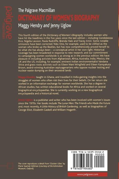The Palgrave Macmillan Dictionary of Women's Biography contains details of the lives of over 2100 women from all periods, cultures and walks of life - from queens to TV chefs, engineers to stand up comics, pilots to poisoners. With subsections for further reading, comprehensive subject index and a bibliographical survey, this dictionary of women's biography is an invaluable reference source.
