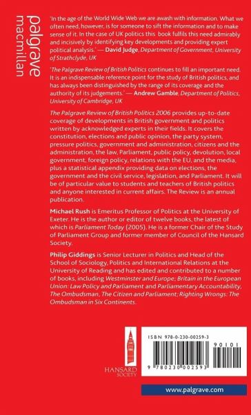 The Palgrave Review of British Politics 2006 provides up-to-date coverage of developments in British government and politics written by a team of leading experts. This is an indispensable reference book covering the entire political year focussing on the key topics. It also includes a statistical appendix.