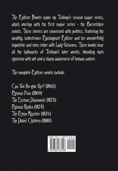 The Palliser Novels make up Trollope's second major series, which overlap with the first major series - the Barsetshire novels. These stories are concerned with politics, featuring the wealthy, industrious Plantagenet Palliser and his wonderfully impulsive and even richer wife Lady Glencora. These books bear all the hallmarks of Trollope's later works, blending dark cynicism with wit and a sharp awareness of human nature. The complete Palliser novels include: Can You Forgive Her? (1865) Phineas Finn (1869) The Eustace Diamonds (1873) Phineas Redux (1874) The Prime Minister (1876) The Duke's Children (1880)
