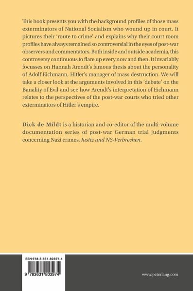 This book presents you with the background profiles of those mass exterminators of National Socialism who wound up in court. It pictures their 'route to crime' and explains why their court room profiles have always remained so controversial in the eyes of post-war observers and commentators. Both inside and outside academia, this controversy continuous to flare up every now and then. It invariably focusses on Hannah Arendt's famous thesis about the personality of Adolf Eichmann, Hitler's manager of mass destruction. We will take a closer look at the arguments involved in this 'debate' on the Banality of Evil and see how Arendt's interpretation of Eichmann relates to the perspectives of the post-war courts who tried other exterminators of Hitler's empire.