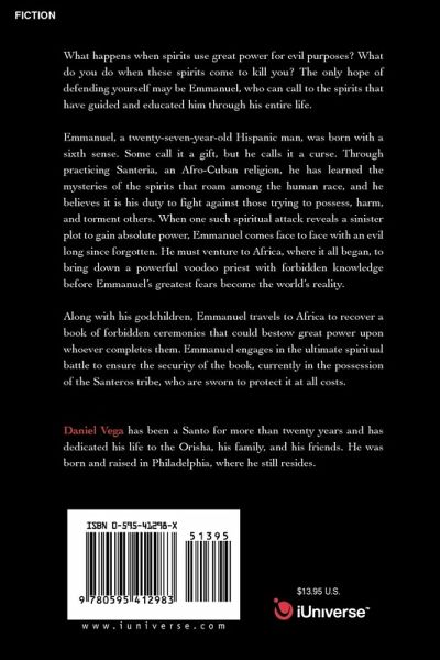 What happens when spirits use great power for evil purposes? What do you do when these spirits come to kill you? The only hope of defending yourself may be Emmanuel, who can call to the spirits that have guided and educated him through his entire life. Emmanuel, a twenty-seven-year-old Hispanic man, was born with a sixth sense. Some call it a gift, but he calls it a curse. Through practicing Santeria, an Afro-Cuban religion, he has learned the mysteries of the spirits that roam among the human race, and he believes it is his duty to fight against those trying to possess, harm, and torment others. When one such spiritual attack reveals a sinister plot to gain absolute power, Emmanuel comes face to face with an evil long since forgotten. He must venture to Africa, where it all began, to bring down a powerful voodoo priest with forbidden knowledge before Emmanuel's greatest fears become the world's reality. Along with his godchildren, Emmanuel travels to Africa to recover a book of forbidden ceremonies that could bestow great power upon whoever completes them. Emmanuel engages in the ultimate spiritual battle to ensure the security of the book, currently in the possession of the Santeros tribe, who are sworn to protect it at all costs.