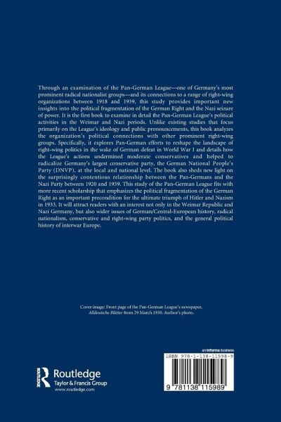 Through an examination of the Pan-German League, one of Germany's most prominent radical nationalist groups, and its connections to a range of right-wing organisations between 1918 and 1939, this study provides important new insights into the political fragmentation of the German Right and the Nazi seizure of power. It is the first book to examine in detail the Pan-German League's political activities in the Weimar and Nazi periods.