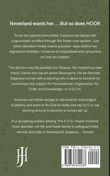 Neverland wants her...but so does H.O.O.K. Since her parents were killed, Vivienne has always felt ungrounded, shuffled through the foster care system. Just when liberation finally seems possible-days before her eighteenth birthday-Vivienne is hospitalized with symptoms no one can explain. The doctors may be puzzled, but Deacon, her mysterious new friend, claims she has an active Nevergene. His far-fetched diagnosis comes with a warning: she is about to become an involuntary test subject for Humanitarian Organization for Order and Knowledge-or H.O.O.K. Vivienne can either escape to Neverland's Kensington Academy and learn to fly (Did he really just say fly?) or risk sticking around to become a human lab rat. But accepting a place among The P.A.N. means Vivienne must abandon her life and foster family to safeguard their secrets and hide in Neverland's shadows... forever.