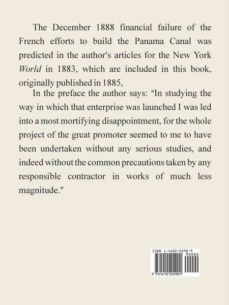 Originally published in 1885, the December 1888 financial failure of the French efforts to build the Panama Canal of December 1888 was predicted in the author's articles for the New York World in 1883. In the preface the author says: "In studying the way in which that enterprise was launched I was led into a most mortifying disappointment, for the whole project of the great promoter seemed to me to have been undertaken without any serious studies, and indeed without the common precautions taken by any responsible contractor in works of much less magnitude."