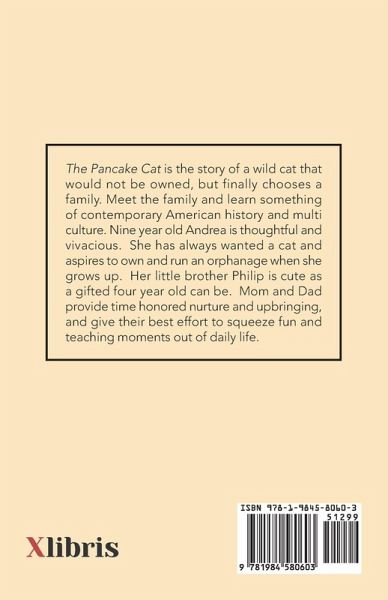 The Pancake Cat is the story of a wild cat that would not be owned, but finally chooses a family. Meet the family and learn something of contemporary American history and multi-culture in the pages. Nine year old Andrea is thoughtful and vivacious. She has always wanted a cat and aspires to own and run an orphanage when she grows up. Her little brother Philip is cute as a gifted four year old can be. Mom and Dad provide time honored nurture and upbringing; and give their best effort to squeeze fun and teaching moments out of daily life.