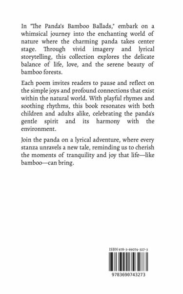 In "The Panda's Bamboo Ballads," embark on a whimsical journey into the enchanting world of nature where the charming panda takes center stage. Through vivid imagery and lyrical storytelling, this collection explores the delicate balance of life, love, and the serene beauty of bamboo forests. Each poem invites readers to pause and reflect on the simple joys and profound connections that exist within the natural world. With playful rhymes and soothing rhythms, this book resonates with both children and adults alike, celebrating the panda's gentle spirit and its harmony with the environment. Join the panda on a lyrical adventure, where every stanza unravels a new tale, reminding us to cherish the moments of tranquility and joy that life-like bamboo-can bring.