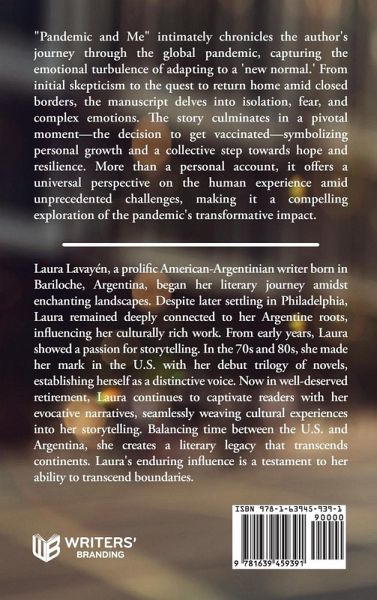 Book Synopsis: "Pandemic and Me" intimately chronicles the author's journey through the global pandemic, capturing the emotional turbulence of adapting to a 'new normal.' From initial skepticism to the quest to return home amid closed borders, the manuscript delves into isolation, fear, and complex emotions. The story culminates in a pivotal moment-the decision to get vaccinated-symbolizing personal growth and a collective step towards hope and resilience. More than a personal account, it offers a universal perspective on the human experience amid unprecedented challenges, making it a compelling exploration of the pandemic's transformative impact. Author's Biography: Laura Lavayén, a prolific American-Argentinian writer born in Bariloche, Argentina, began her literary journey amidst enchanting landscapes. Despite later settling in Philadelphia, Laura remained deeply connected to her Argentine roots, influencing her culturally rich work. From early years, Laura showed a passion for storytelling. In the 70s and 80s, she made her mark in the U.S. with her debut trilogy of novels, establishing herself as a distinctive voice. Now in well-deserved retirement, Laura continues to captivate readers with her evocative narratives, seamlessly weaving cultural experiences into her storytelling. Balancing time between the U.S. and Argentina, she creates a literary legacy that transcends continents. Laura's enduring influence is a testament to her ability to transcend boundaries.