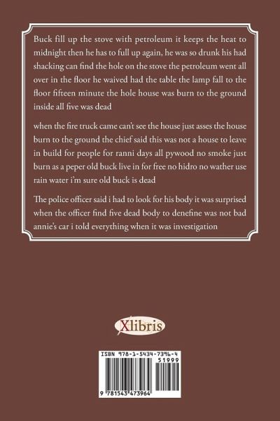 Buck fill up the stove with petroleum it keeps the heat to midnight then he has to full up again, he was so drunk his had shacking can find the hole on the stove the petroleum went all over in the floor he waived had the table the lamp fall to the floor fifteen minute the hole house was burn to the ground Inside all five was dead WHEN THE FIRE TRUCK CAME CAN'T SEE THE HOUSE JUST ASSES THE HOUSE BURN TO THE GROUND THE CHIEF SAID THIS WAS NOT A HOUSE TO LEAVE IN BUILD FOR PEOPLE FOR RANNI DAYS ALL PYWOOD NO SMOKE JUST BURN AS A PEPER OLD BUCK LIVE IN FOR FREE NO HIDRO NO WATHER USE RAIN WATER I'M SURE OLD BUCK IS DEAD THE POLICE OFFICER SAID I HAD TO LOOK FOR HIS BODY IT WAS SURPRISED WHEN THE OFFICER FIND FIVE DEAD BODY TO DENEFINE WAS NOT BAD ANNIE'S CAR I TOLD EVERYTHING WHEN IT WAS INVESTIGATION