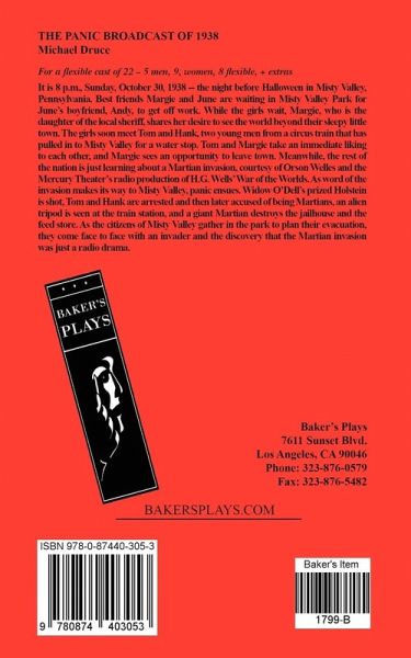 5m, 9f, + extras, flexible casting / Comedy, High School/ Community Theatre / Unit set Panic Broadcast of 1938 is the story of some bold teenagers and one crazy, confusing night! It is 8 p.m., Sunday, October 30, 1938 -- the night before Halloween in Misty Valley, Pennsylvania. Two optimistic and wide-eyed young women, Margie and June, are waiting in the park for June's boyfriend, Andy, to get off work. Both teens have dilemmas: Margie wants to leave town and June doesn't know if she should