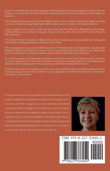 My name is Asher Miller, and I'm a private investigator. After my last big case, solving the disappearance of movie star Rosa Delgato, it was time to take a step back. That meant leaving the big, stressful city and returning to Cochico Village, my hometown. The first impression tourists get is that Cochico Village is a quiet, small town. Well, I know that the village is more than meets the eye. Sometimes strange things happen, but the residents seem not to notice, or they simply are used to it. Anyway, I intend to take it easy for a while, read a good book, and visit friends. But as things often go, plans change. Charlotte Wilson, one of my dearest friends, goes missing. So, when her father, the governor of New York, calls me for help, I can't refuse. Then, Detective Declan Campbell, also a village resident, asks for my help because his younger brother is also missing. He exited the plane and disappeared between the airport and the village. The two missing persons' cases cross, and all the leads point to The Panthera Hotel, which appeared out of the blue. Even though the hotel puts up its defense, I'm tenacious and won't stop until I have figured out the hotel's secret. What I don't know is that the hotel has a rich history, which goes all the way back to 1649. That's when it all started. But as the case progresses, I encounter ghosts and demons and learn more about myself. Time passes, and I must hurry to save the missing persons. I even travel to the demon realm and the astral plane because I do everything to gather information. Time is running out when the past catches up; it will destroy the hotel and everyone in it. The hotel took too many lives already because of the curse. I ask myself: will I be able to save all those trapped inside? The hotel again manages to take one life, and another is in grave danger. But is it the hotel that's after him, or someone else? Can I prevent a second murder?