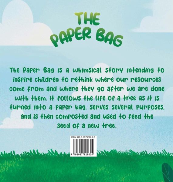 The Paper Bag is a whimsical story intending to inspire children to rethink where our resources come from and where they go after we are done with them. It follows the life of a tree as it is turned into a paper bag, serves several purposes, and is then composted and used to feed the seed of a new tree.