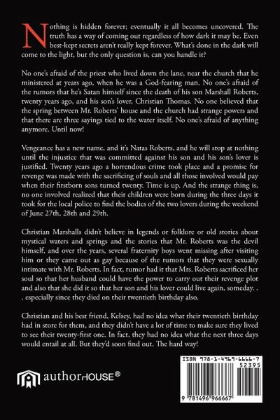Nothing is hidden forever; eventually it all becomes uncovered. The truth has a way of coming out regardless of how dark it may be. Even best-kept secrets aren't really kept forever. What's done in the dark will come to the light, but the only question is, can you handle it? No one's afraid of the priest who lived down the lane, near the church that he ministered at years ago, when he was a God-fearing man. No one's afraid of the rumors that he's Satan himself since the death of his son Marshall Roberts, twenty years ago, and his son's lover, Christian Thomas. No one believed that the spring between Mr. Roberts' house and the church had strange powers and that there are three sayings tied to the water itself. No one's afraid of anything anymore. Until now! Vengeance has a new name, and it's Natas Roberts, and he will stop at nothing until the injustice that was committed against his son and his son's lover is justified. Twenty years ago a horrendous crime took place and a promise for revenge was made with the sacrificing of souls and all those involved would pay when their firstborn sons turned twenty. Time is up. And the strange thing is, no one involved realized that their children were born during the three days it took for the local police to find the bodies of the two lovers during the weekend of June 27th, 28th and 29th. Christian Marshalls didn't believe in legends or folklore or old stories about mystical waters and springs and the stories that Mr. Roberts was the devil himself, and over the years, several fraternity boys went missing after visiting him or they came out as gay because of the rumors that they were sexually intimate with Mr. Roberts. In fact, rumor had it that Mrs. Roberts sacrificed her soul so that her husband could have the power to carry out their revenge plot and also that she did it so that her son and his lover could live again, someday. . . especially since they died on their twentieth birthday also. Christian and his best friend, Kelsey, had no idea what their twentieth birthday had in store for them, and they didn't have a lot of time to make sure they lived to see their twenty-first one. In fact, they had no idea what the next three days would entail at all. But they'd soon find out. The hard way!