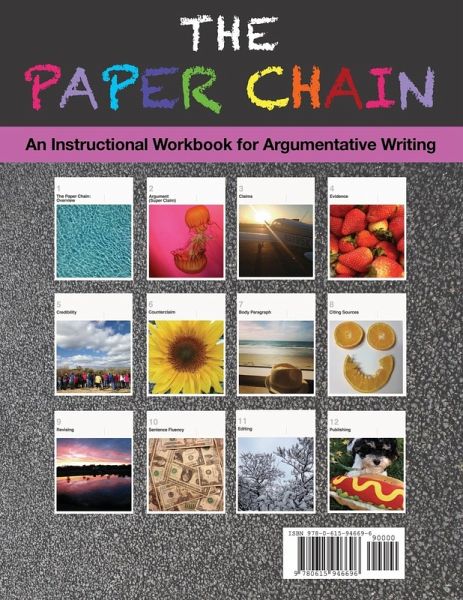 This colorful and exciting 80-page workbook was designed to help adolescents through each and every step of writing an argument essay. This workbook is created by veteran teachers and follows the guidelines of the Common Core State Standards for argumentative writing. It is the result of 7 years of action research, 30 years of combined classroom teaching experience, and student feedback. This instructional guide is filled with worksheets, models, easy-to-follow instructions, and graphic organizers. From start to finish, you will be guided through every step of the writing process. The Paper Chain Instructional Workbook for Argumentative writing is authored by Kristen Dembroski with contributions by Linda Quesnell.