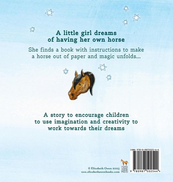 A little girl dreams of having her own horse. She lives on a farm and longs to ride alongside her father as he goes about his work as a jackaroo. One day she discovers a book with instructions to make a horse - out of paper! Straight away the little girl gathers everything the book says she needs to make the paper horse. Page by page, she follows the instructions, adding her own creative flair until the paper horse is finished! The little girl goes to sleep with the paper horse beside her bed - and magic unfolds... An engaging story of dreams & creativity, written by the author at 8 years old and illustrated by her decades later!