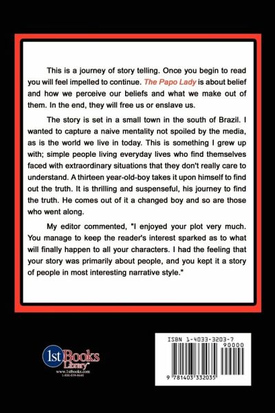"The Papo Lady" is about a mysterious woman who comes to a small town every ten years; carrying on her head a basket with nine wishes, some she shares some she spares and others she doesn't care. What ever way someone gets the wish, his life is forever changed.
