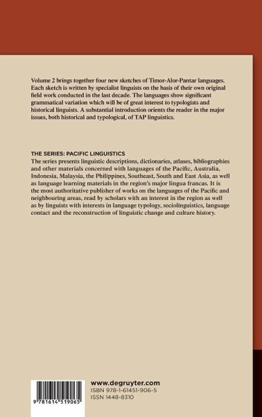 Volume 2 brings together four new sketches of Timor-Alor-Pantar languages. Each sketch is written by specialist linguists on the basis of their own original field work conducted in the last decade. The languages show significant grammatical variation which will be of great interest to typologists and historical linguists. A substantial introduction orients the reader in the major issues, both historical and typological, of TAP linguistics.