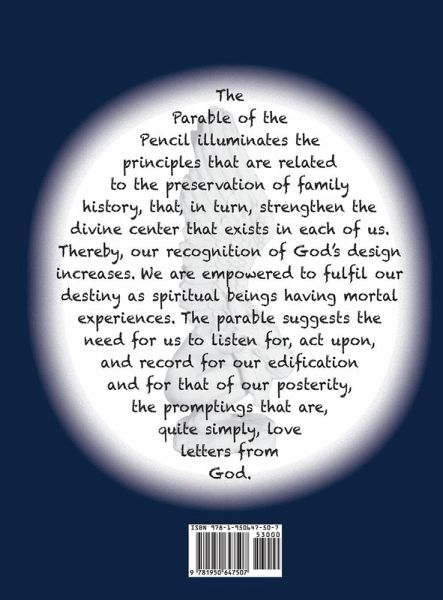 The Parable of the Pencil illuminates the principles related to the preservation of family history to strengthen the divine center in each of us. Thereby, our recognition of God's design increases. We are empowered to fulfill our destiny as spiritual beings having mortal experiences. The parable suggests that we need only to listen for, act upon, and record for our edification and that of our posterity, the sweet stirrings that are spiritual promptings. "Adam spake, as he was moved upon by the Holy Ghost, and a genealogy was kept of the children of God. And this was the book of the generations of Adam." (Moses 6:8).
