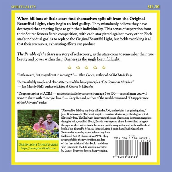 When billions of little stars find themselves split off from the Original Beautiful Light, they begin to feel guilty. They mistakenly believe they have destroyed that amazing light to gain their individuality. This sense of separation from their Source fosters fierce competition, with each star pitted against every other. Each star’s individual goal is to replace the Original Beautiful Light, but feeble twinkling is all that their strenuous, exhausting efforts can produce. The Parable of the Stars is a brief & entertaining illustrated story of rediscovery, as the stars come to remember their true beauty and power within their Oneness as the single beautiful Light.