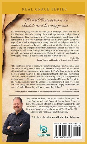 "The Real Grace series is an absolute must for every person. It is a wonderful, easy read that will bind you to it through the freedom and life it is filled with. My understanding of the teachings, miracles, and parables of Jesus broadened in a tremendous way. This series reveals many hidden truths contained in the Hebrew culture and history that many don't have the knowl- edge of, but which are important to seeing the true love and grace revealed in everything Jesus said and did. As I read the series it felt like sitting at the feet of Jesus, asking Him to explain Himself in what He did and said. It is as if He was sitting down with me explaining it in a loving, non-condemning way that leaves me with inner peace and outrageous joy. Pastor Greg did a tremendous job in writing this series. It is truly divinely inspired. A must for us all." - Bertie Brits Pastor, Teacher and Founder of Dynamic Love Ministries "The Real Grace series of books, The Teachings of Jesus, The Parables of Jesus, and The Miracles of Jesus, are some of the best teaching on the life and words of Jesus that I have ever read. As a student of God's Word and a minister of the Gospel of Grace, many of the things that Jesus taught often made me wonder, "What did Jesus really mean by that?" Pastor Greg takes you through some of the hard sayings of Jesus and reveals the glorious Good News of the Gospel. It's like reading those stories in the Gospels for the first time with fresh eyes to see. You'll see things like you've never seen them before. I highly recommend this series of books. I know they will bless you as they did me." - Connie Witter Author, Speaker, and Founder of Because of Jesus Ministries ¿ www.conniewitter.com