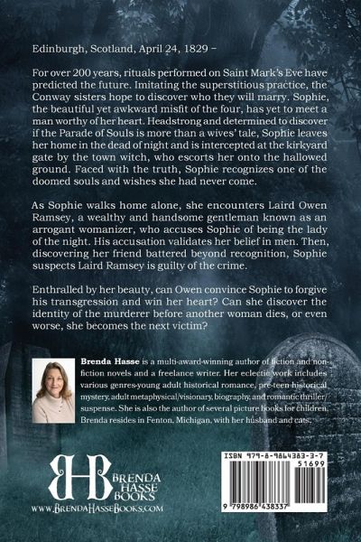 When it is better not to know... Edinburgh, Scotland - April 24, 1829 For over 200 years, rituals performed on Saint Mark's Eve have predicted the future. Imitating the superstitious practice, the Conway sisters hope to discover who they will marry. Sophie, the beautiful yet awkward misfit of the four, has yet to meet a man worthy of her heart. She is more interested in learning if the Parade of Souls is more than a wives' tale. Headstrong and determined to discover the truth, she leaves the safety of her home in the dead of night and walks to the kirkyard. Sophie is intercepted at the gate by the town witch, who agrees to escort her onto the hallowed ground. Faced with the truth, Sophie recognizes one of the doomed souls and wishes she had never come. As Sophie walks home alone, her chance encounter with Laird Owen Ramsey, a wealthy and handsome gentleman with a misunderstood reputation as an arrogant womanizer, accuses Sophie of being a lady of the night. Validating her belief in men, she swears he would be the last man she would ever marry. Then, discovering her friend battered beyond recognition, Sophie suspects Laird Ramsey is guilty of the crime. Enthralled by her beauty, can Owen convince Sophie to forgive his transgression and win her heart? Can she discover the identity of the murderer before another woman dies, or even worse, she becomes the next victim?