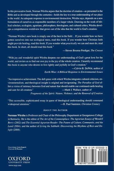 It has become a commonplace that Biblical religion bears a heavy share of responsibility for our past negligence towards the environment. In this provocative book, Norman Wirzba argues that the Biblical doctrine of creation actually holds the key to a true understanding of our place in the environment and our responsibility toward it. Wirzba contends that an adequate response to environmental destruction depends on a new formulation of ourselves as part of a larger whole, rather than as radically free individuals. Drawing on the work of biblical scholars, ecologists, agrarians, philosophers, theologians, and cultural critics, Wirzba presents a compelling vision of a new religious environmentalism.