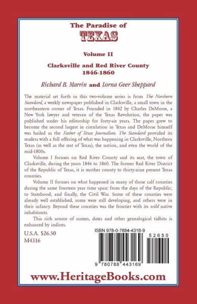 The material set forth in this two-volume series is from The Northern Standard, a weekly newspaper published in Clarksville, a small town in the northeastern corner of Texas. Founded in 1842 by Charles DeMorse, a New York lawyer and veteran of the Texas Revolution, the paper was published under his editorship for forty-six years. The paper grew to become the second largest in circulation in Texas and DeMorse himself was hailed as the Father of Texas Journalism. The Standard provided its readers with a full offering of what was happening in Clarksville, Northern Texas (as well as the rest of Texas), the nation, and even the world of the mid-1800s. Volume I focuses on Red River County and its seat, the town of Clarksville, during the years 1846 to 1860. The former Red River District of the Republic of Texas, it is mother county to thirty-nine present Texas counties. Volume II focuses on what happened in many of those calf counties during the same fourteen year time span: from the days of the Republic, to Statehood, and finally, the Civil War. Some of these counties were already well established, some were still developing, and others were in their infancy. Beyond these counties was the frontier with its wild native inhabitants. This rich source of names, dates and other genealogical tidbits is enhanced by indices.