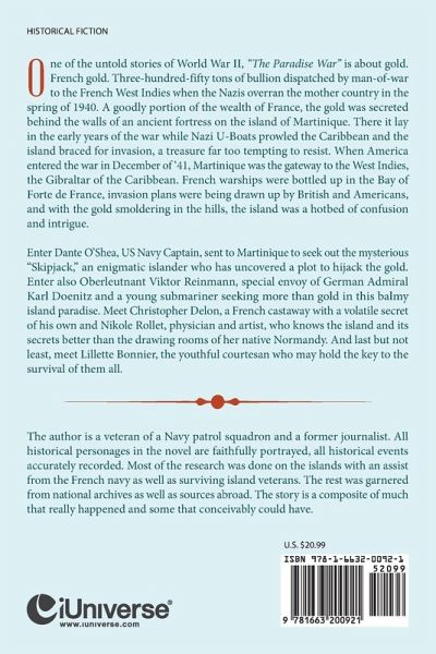 One of the untold stories of World War II, "The Paradise War" is about gold. French gold. Three-hundred-fifty tons of bullion dispatched by man-of-war to the French West Indies when the Nazis overran the mother country in the spring of 1940. A goodly portion of the wealth of France, the gold was secreted behind the walls of an ancient fortress on the island of Martinique. There it lay in the early years of the war while Nazi U-Boats prowled the Caribbean and the island braced for invasion, a treasure far too tempting to resist. When America entered the war in December of '41, Martinique was the gateway to the West Indies, the Gibraltar of the Caribbean. French warships were bottled up in the Bay of Forte de France, invasion plans were being drawn up by British and Americans, and with the gold smoldering in the hills, the island was a hotbed of confusion and intrigue. Enter Dante O'Shea, US Navy Captain, sent to Martinique to seek out the mysterious "Skipjack," an enigmatic islander who has uncovered a plot to hijack the gold. Enter also Oberleutnant Viktor Reinmann, special envoy of German Admiral Karl Doenitz and a young submariner seeking more than gold in this balmy island paradise. Meet Christopher Delon, a French castaway with a volatile secret of his own and Nikole Rollet, physician and artist, who knows the island and its secrets better than the drawing rooms of her native Normandy. And last but not least, meet Lillette Bonnier, the youthful courtesan who may hold the key to the survival of them all.