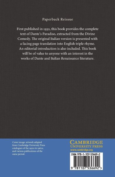 First published in 1932, this book provides the complete text of Dante's Paradiso, extracted from the Divine Comedy. The original Italian version is presented with a facing-page translation into English triple rhyme. An editorial introduction is also included. This book will be of value to anyone with an interest in the works of Dante and Italian Renaissance literature.