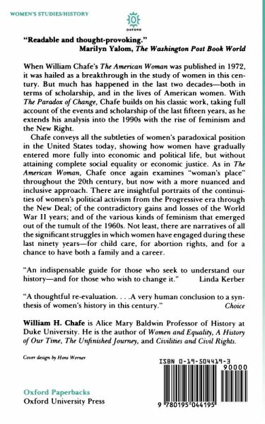 The Paradox of Change is a revised and updated version of William Chafe's classic study The American Woman (1972). Building on his original analysis of the experience of twentieth-century American women, Chafe now also considers the significance of the events of the last two decades. In a period which has seen the rise of both feminism and the New Right, American women have gradually entered more fully into economic and political life, though complete social and economic equality remains elusive. Tension between public and private roles; the increasing feminization of poverty; and the struggle to have both a family and career remain important unresolved issues, each constituting part of the 'paradox of change'.