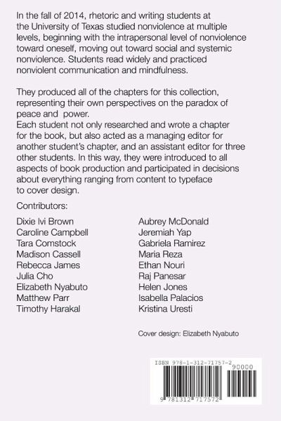 This book is a collection of chapters on the topic of Nonviolence, written by college students at the University of Texas in 2014. Topics include sports, Vietnam war, Civil Rights, comics, the justice system, bullying, music, farming, psychology, religion, culture, self-improvement, and video games. Profits from the sale of this book will go to benefit SafePlace, an Austin non-profit that helps victims of domestic violence and sexual assault.