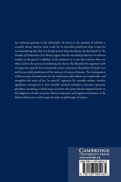 An enduring question in the philosophy of science is the question of whether a scientific theory deserves more credit for its successful predictions than it does for accommodating data that was already known when the theory was developed. In The Paradox of Predictivism, Eric Barnes argues that the successful prediction of evidence testifies to the general credibility of the predictor in a way that evidence does not when the evidence is used in the process of endorsing the theory. He illustrates his argument with an important episode from nineteenth-century chemistry, Mendeleev's Periodic Law and its successful predictions of the existence of various elements. The consequences of this account of predictivism for the realist/anti-realist debate are considerable, and strengthen the status of the 'no miracle' argument for scientific realism. Barnes's important and original contribution to the debate will interest a wide range of readers in philosophy of science.